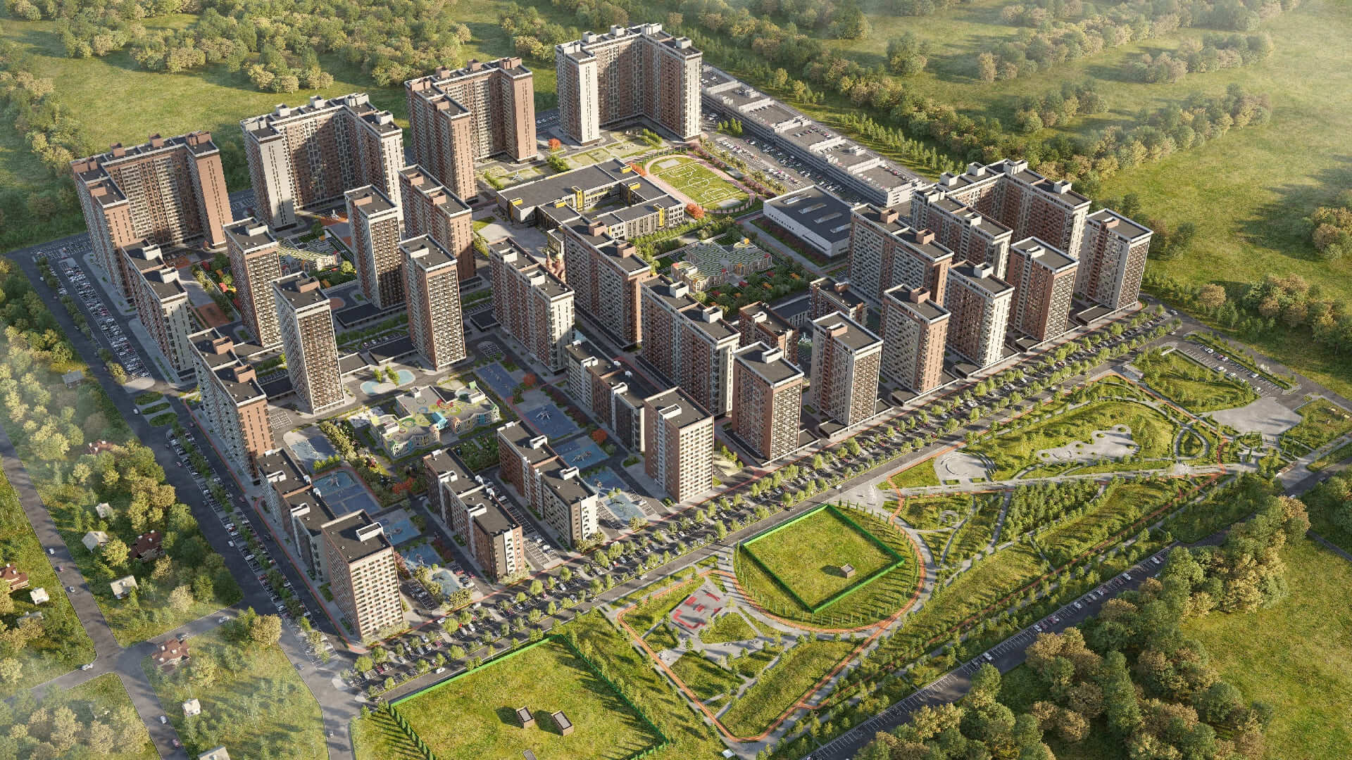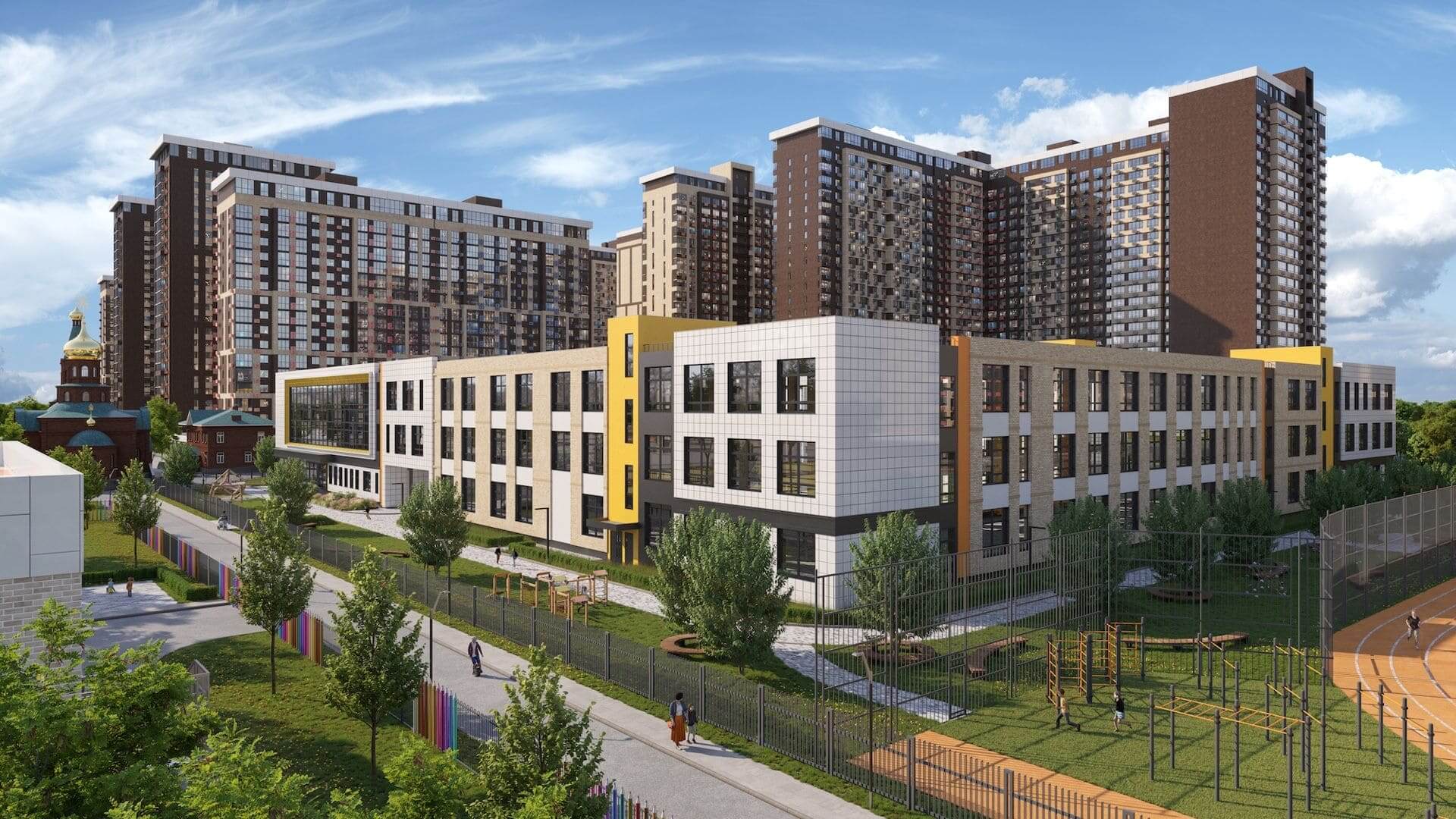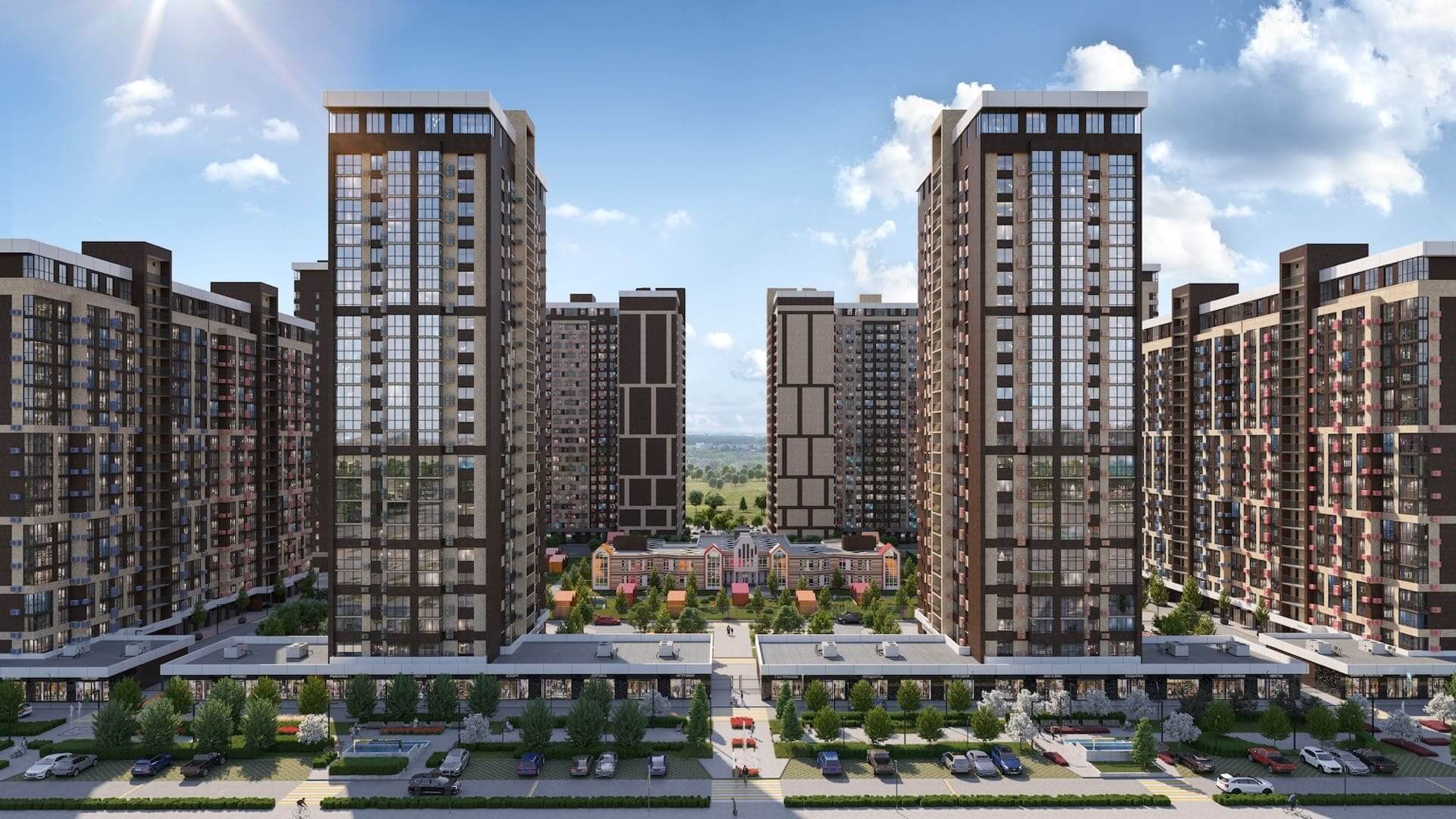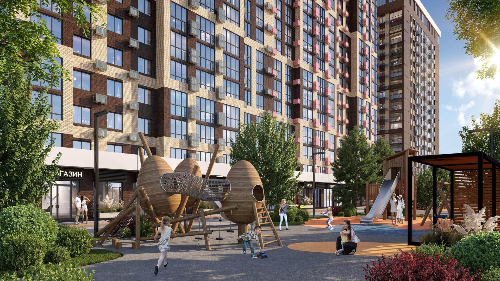 На площади 44 га возводятся 29 домов комфорт-класса высотностью от 9 до 24 этажей, это настоящий город в городе, где предусмотрено все для комфортной жизни: три детских сада на 880 мест, один из которых уже открыт и принимает малышей. Каждая входная группа, оформлена в единой концепции микрорайона. Витринное оформление фасадов выполняет эстетическую функцию, а также, максимально наполняет светом пространство холла.