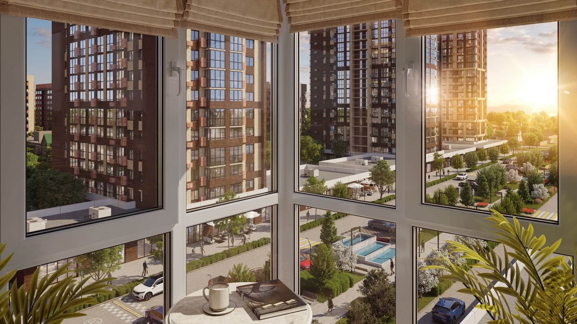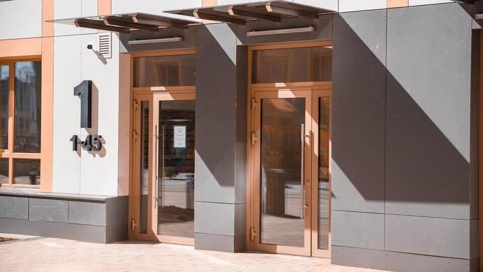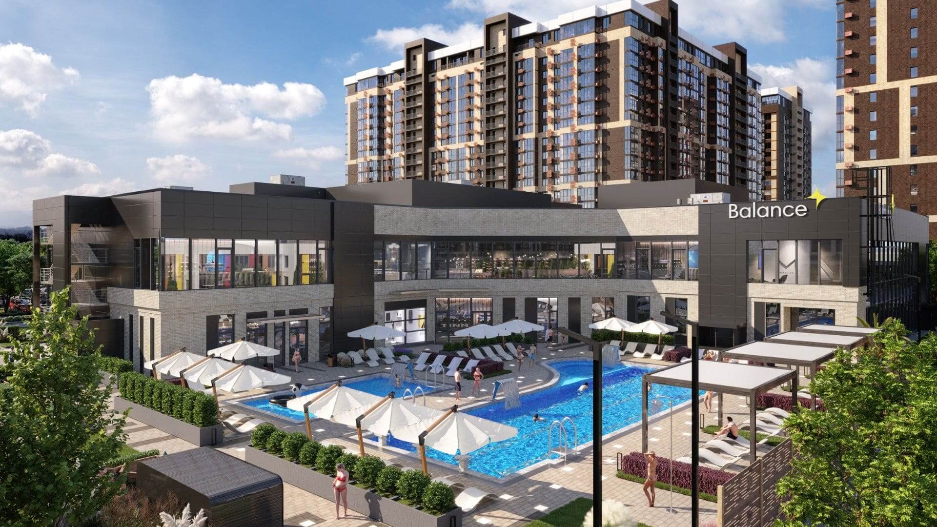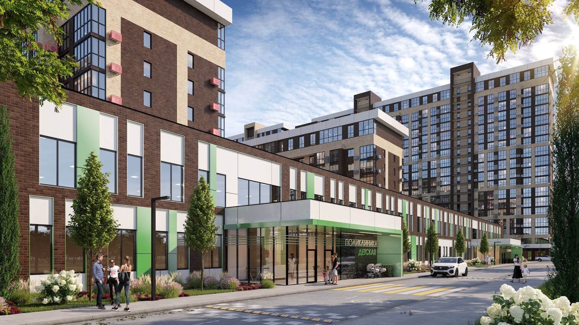 На площади 44 га возводятся 29 домов комфорт-класса высотностью от 9 до 24 этажей, это настоящий город в городе, где предусмотрено все для комфортной жизни: три детских сада на 880 мест, один из которых уже открыт и принимает малышей. Каждая входная группа, оформлена в единой концепции микрорайона. Витринное оформление фасадов выполняет эстетическую функцию, а также, максимально наполняет светом пространство холла.